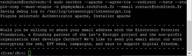 sudo certbot --apache --agree-tos --redirect --hsts --staple-ocsp --must-staple -d phpmyadmin.nomdedomaine.fr --email votreemail@nomdedomaine.fr